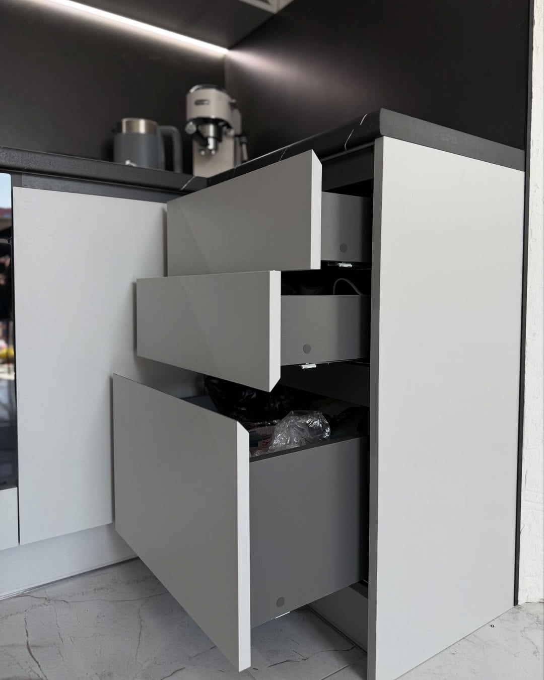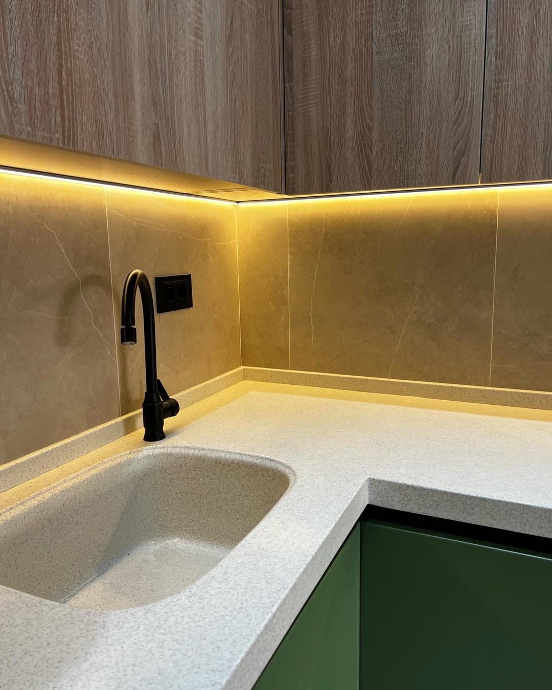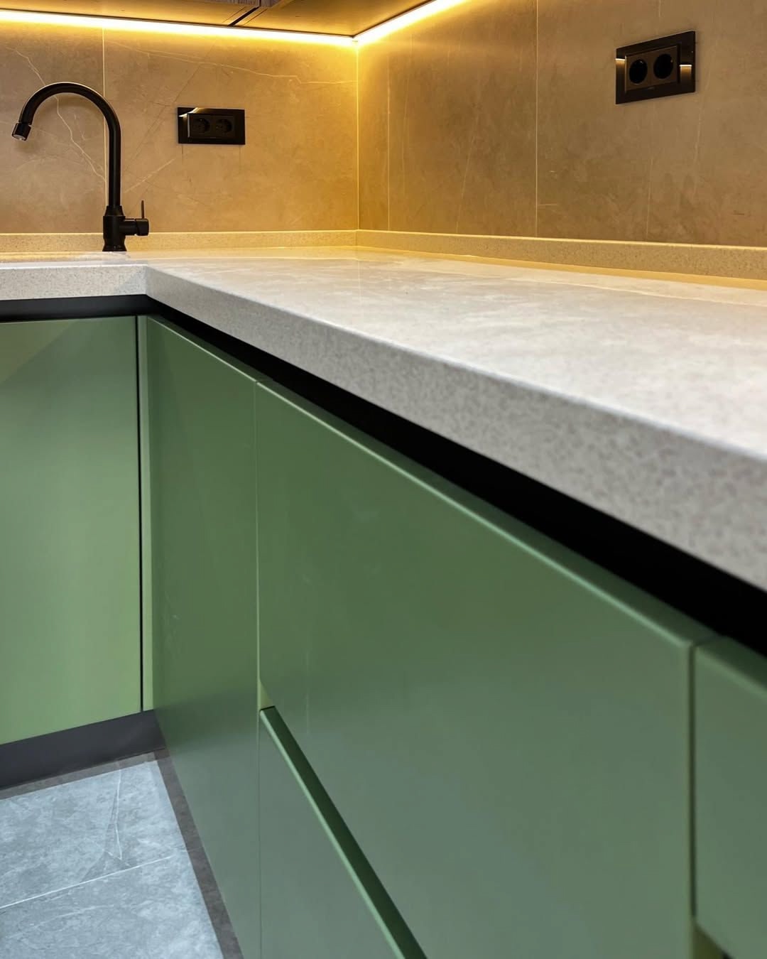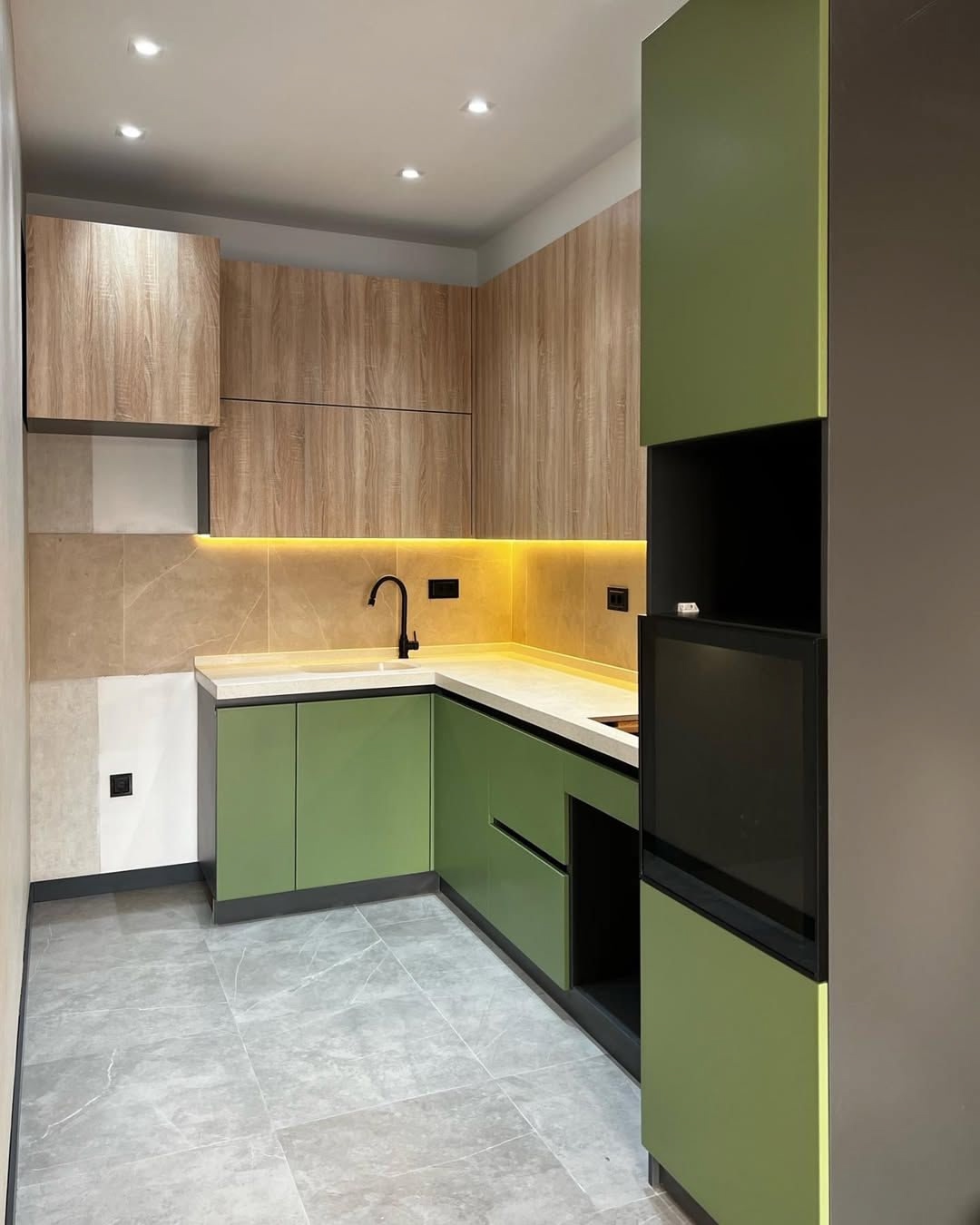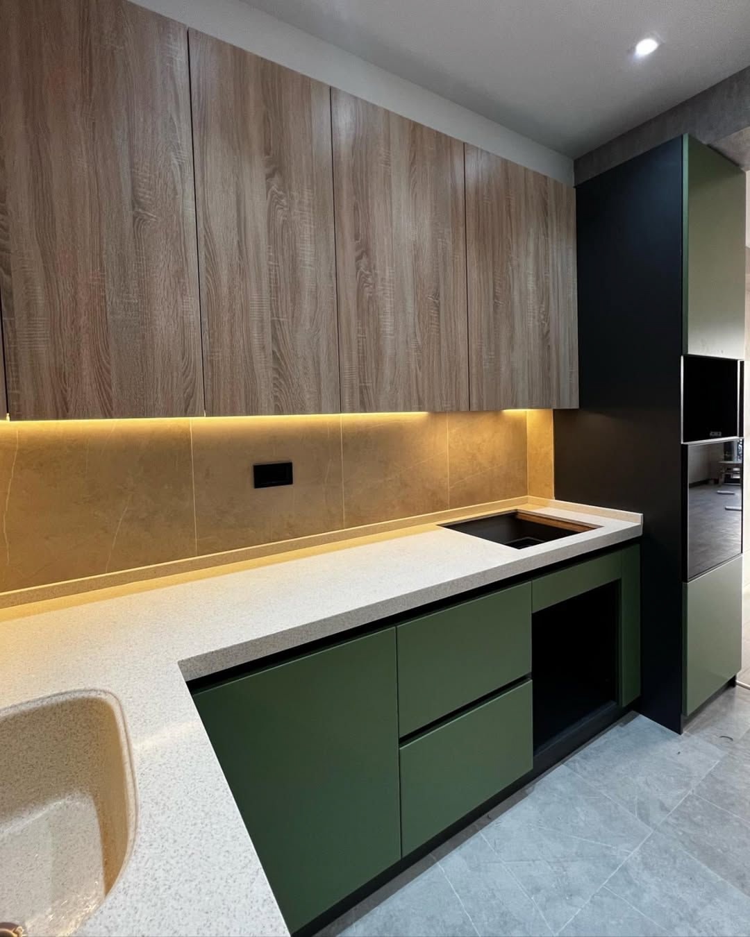 Заказчица сначала сомневалась в цвете фасадов, но в итоге решилась — и не пожалела. Цвет идеально подошёл, смотрится очень современно и уютно. Фасады и корпус — ЛДСП Egger
