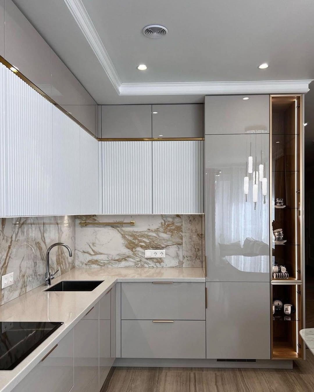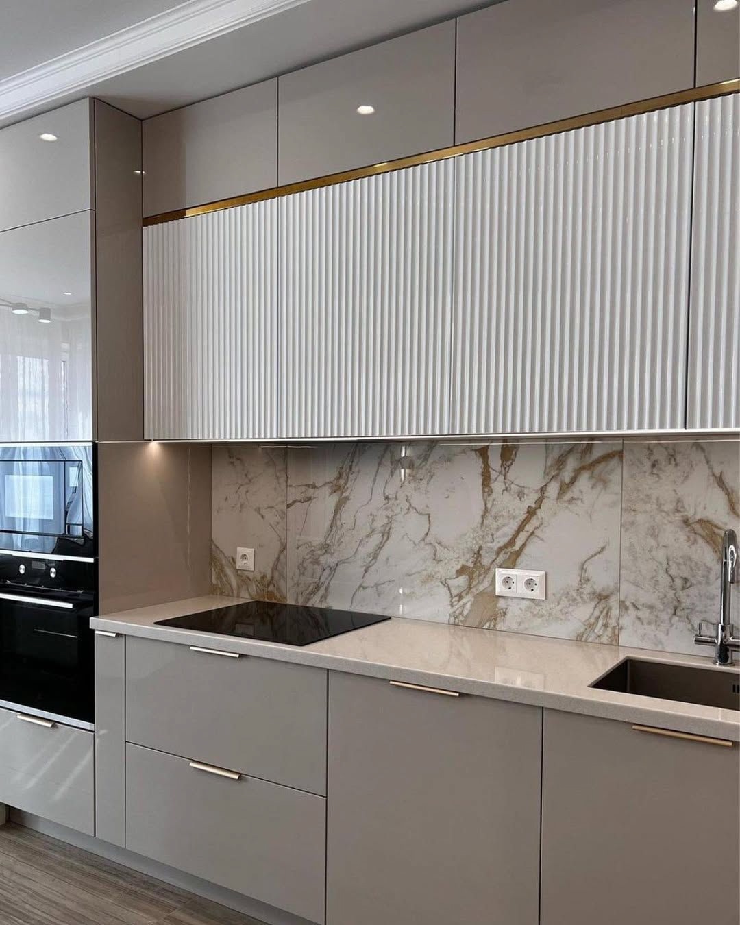 Для Юлии было важно качество, функциональность и конечно эстетичный вид кухни. Поэтому, мы остановились на глянцевой кухне с золотыми вставками.