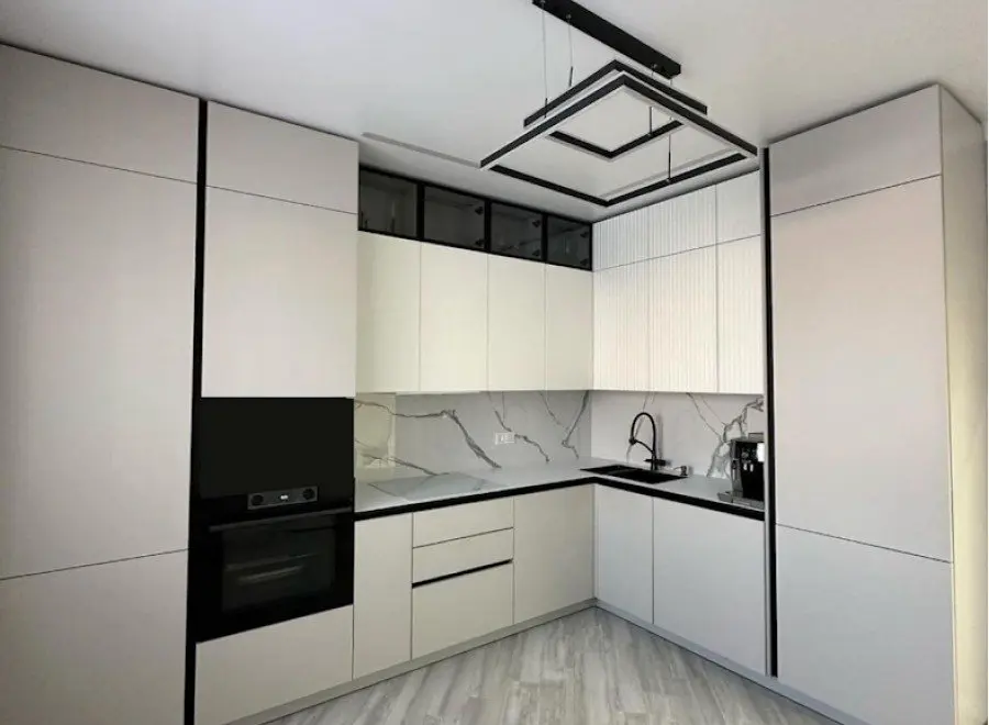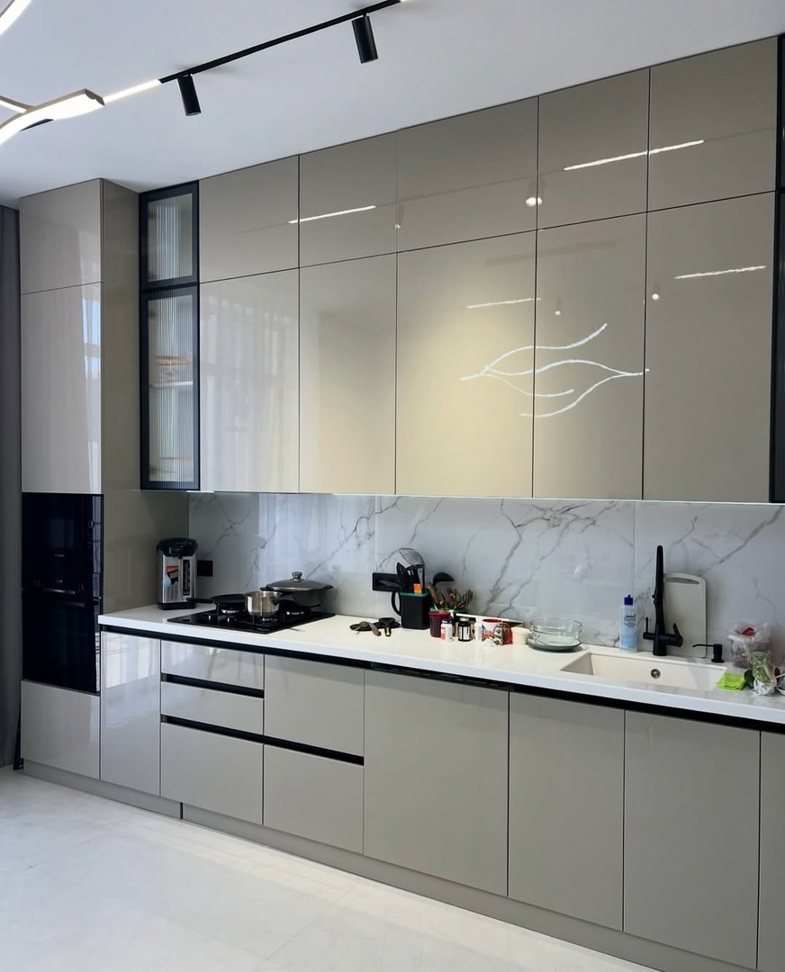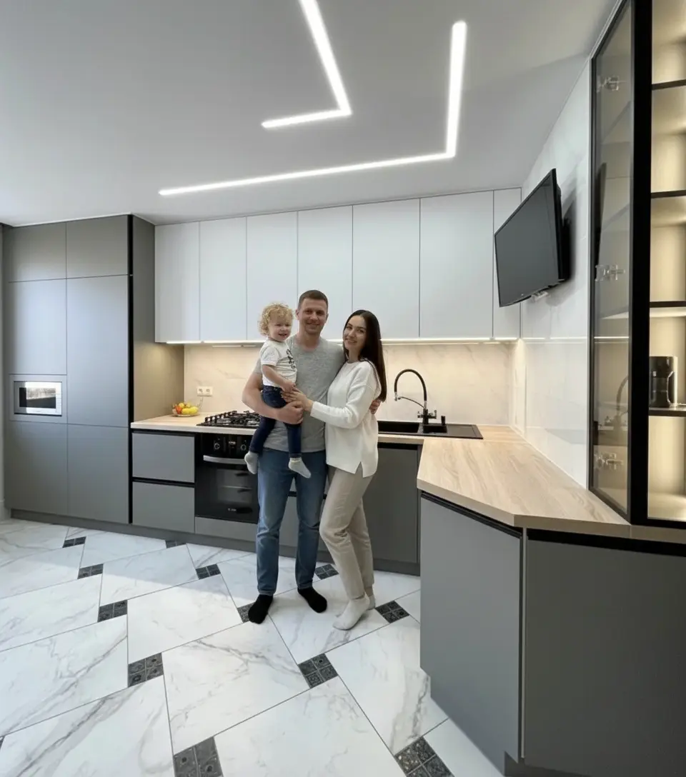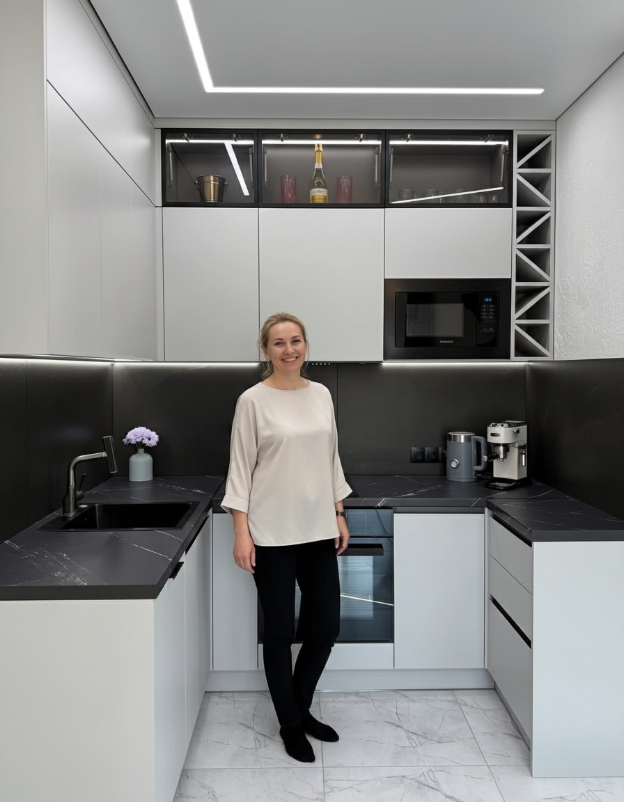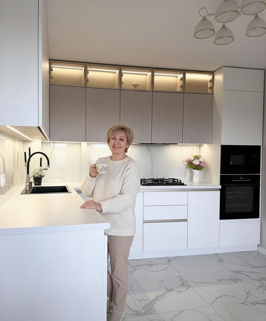 Эту кухню мы сделали для Галины Ивановны. Главный запрос был — чтобы кухня получилась светлая, удобная и без лишних заморочек. Мы сделали современный дизайн в белых и светло-серых тонах, добавили аккуратную подсветку под верхними шкафами и вместительные ящики с доводчиками. Рабочая поверхность — просторная, есть место и для готовки, и для техники.
