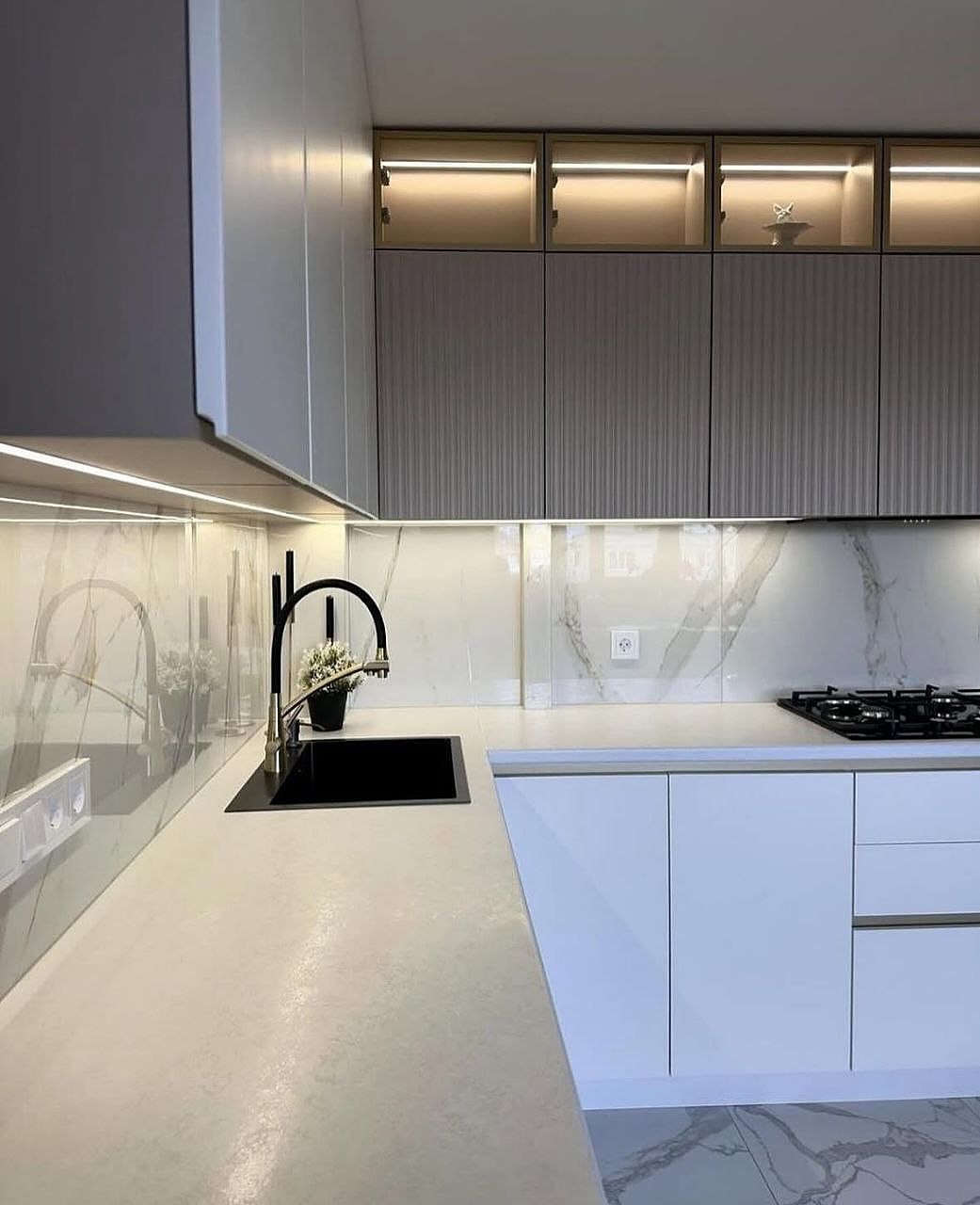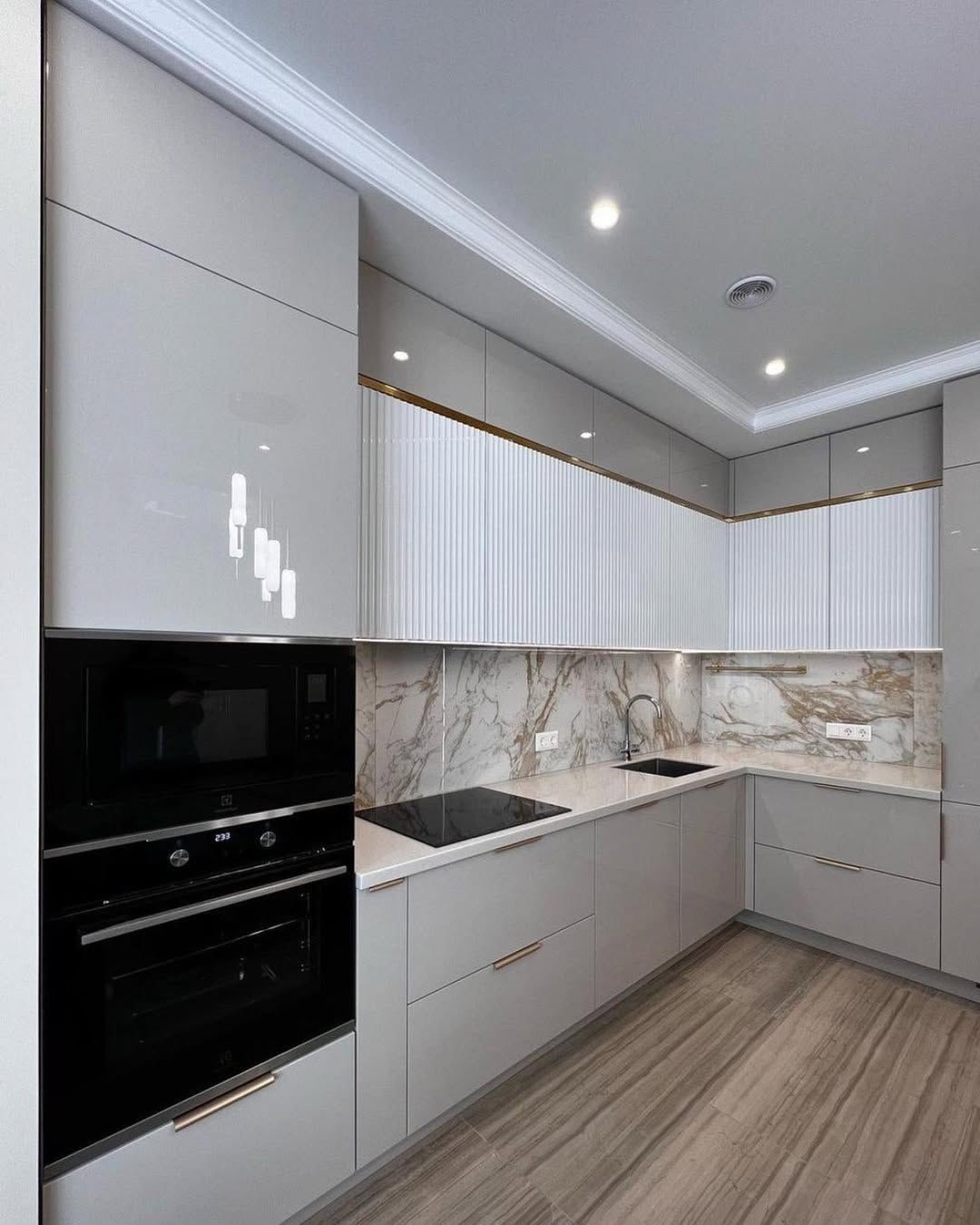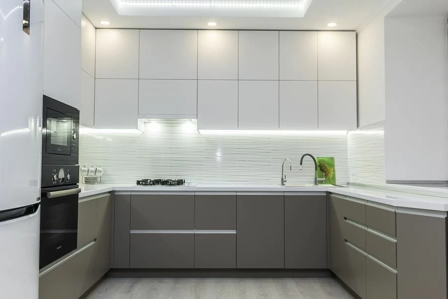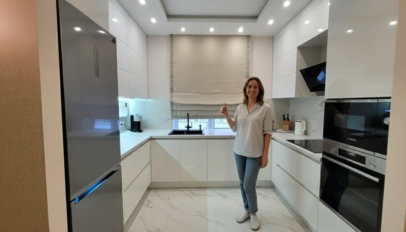 Эту кухню мы сделали для Галины Ивановны. Главный запрос был — чтобы кухня получилась светлая, удобная и без лишних заморочек. Мы сделали современный дизайн в белых и светло-серых тонах, добавили аккуратную подсветку под верхними шкафами и вместительные ящики с доводчиками. Рабочая поверхность — просторная, есть место и для готовки, и для техники.