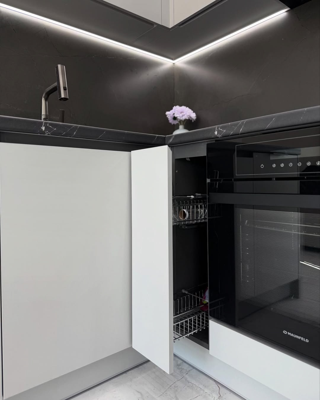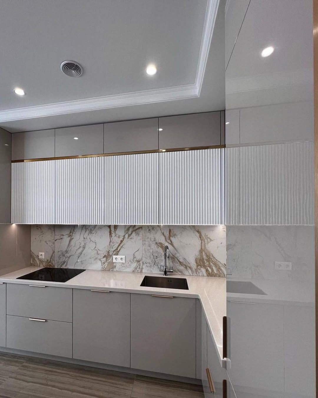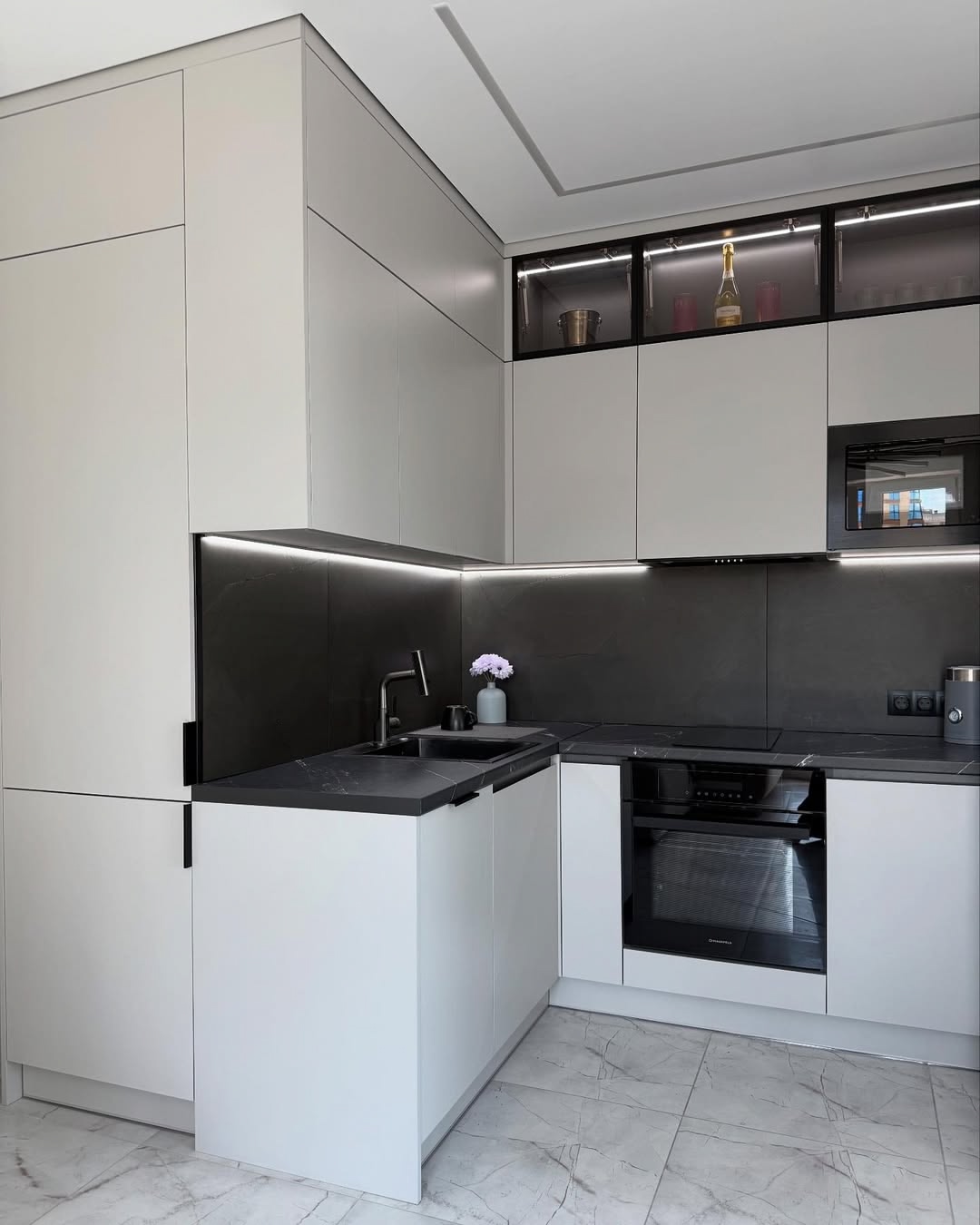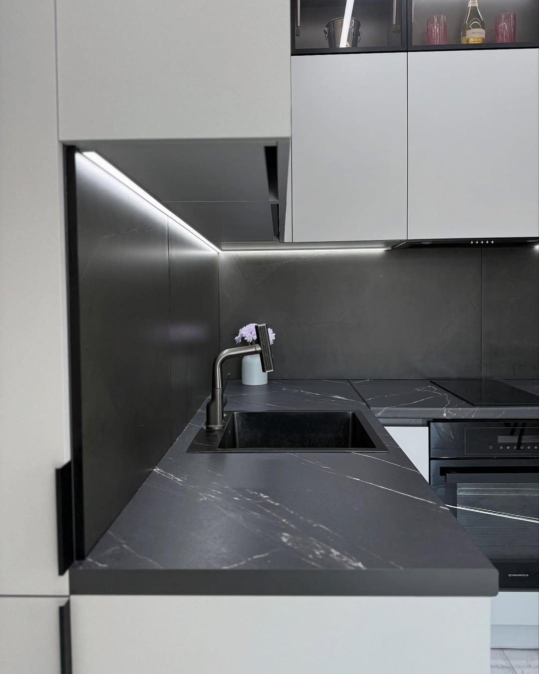 Эту кухню мы сделали для Галины Ивановны. Главный запрос был — чтобы кухня получилась светлая, удобная и без лишних заморочек. Мы сделали современный дизайн в белых и светло-серых тонах, добавили аккуратную подсветку под верхними шкафами и вместительные ящики с доводчиками. Рабочая поверхность — просторная, есть место и для готовки, и для техники.