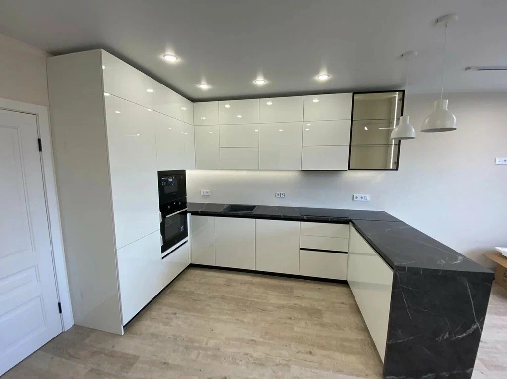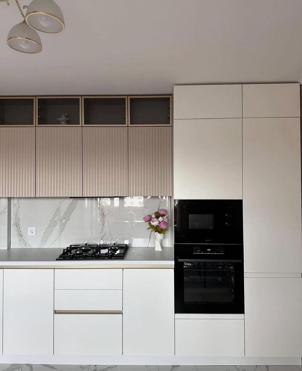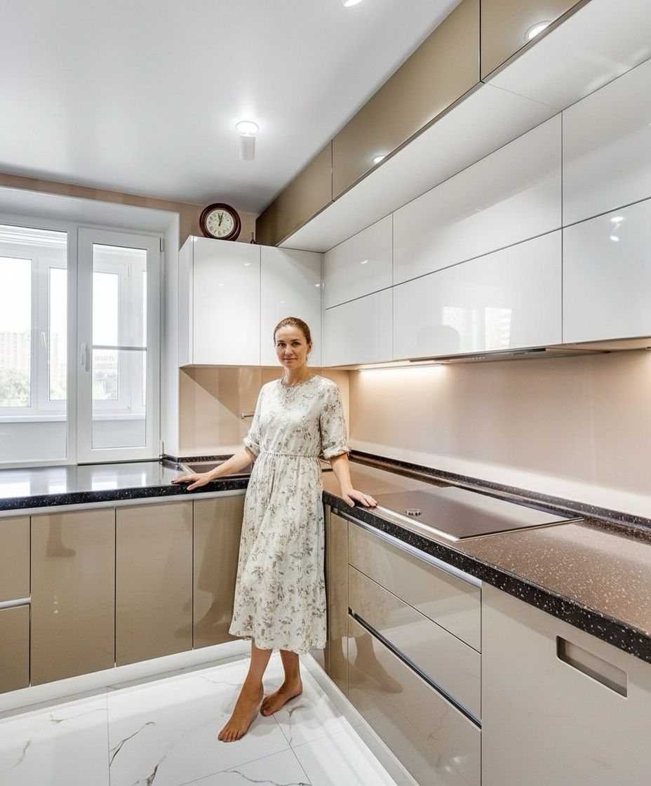 Фасады выбрали глянцевые — белый верх и бежевый низ. Такое сочетание смотрится стильно и современно, плюс глянец визуально расширяет кухню и делает её светлее. Столешница — прочная, тёмная, под камень. На ней удобно работать, не боится горячего и легко моется.