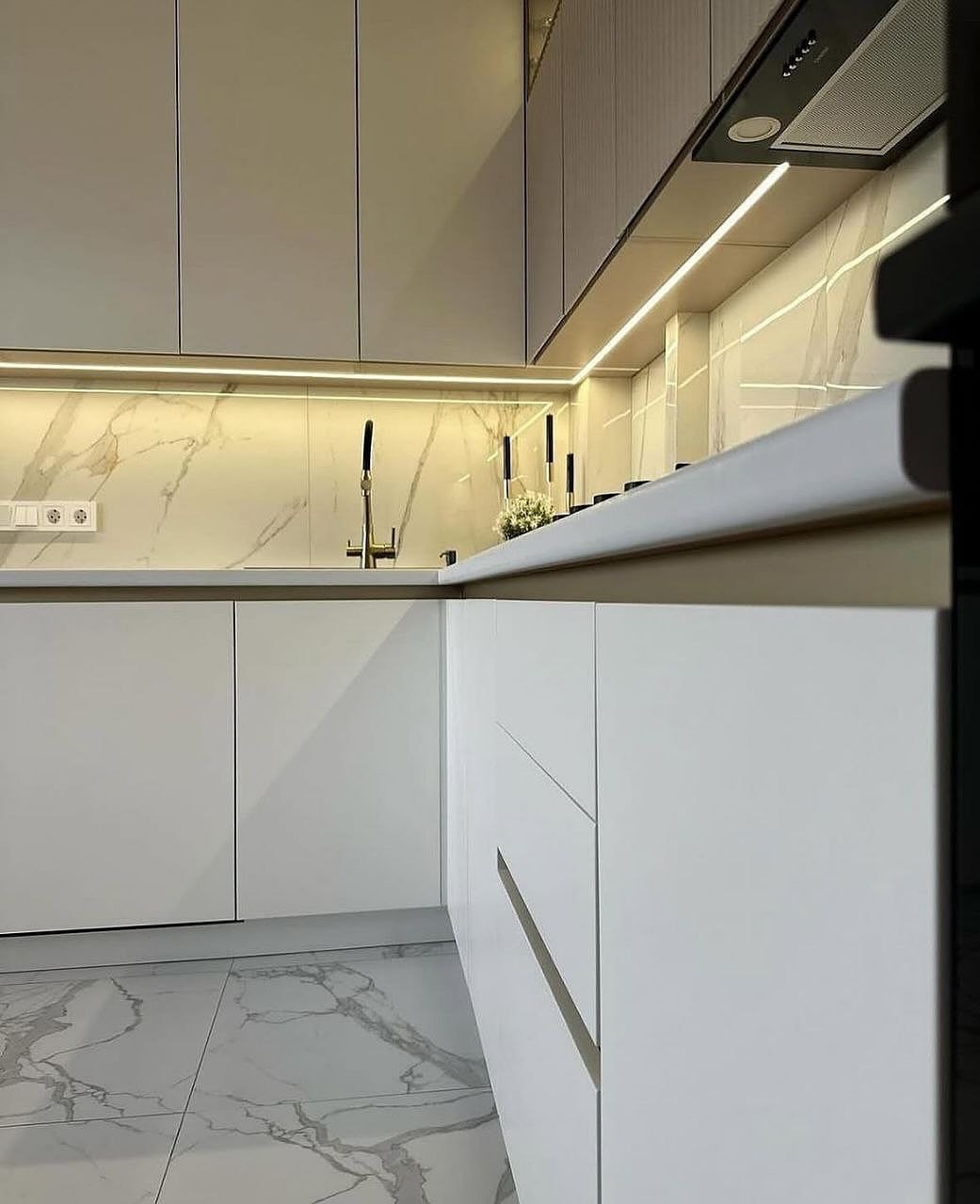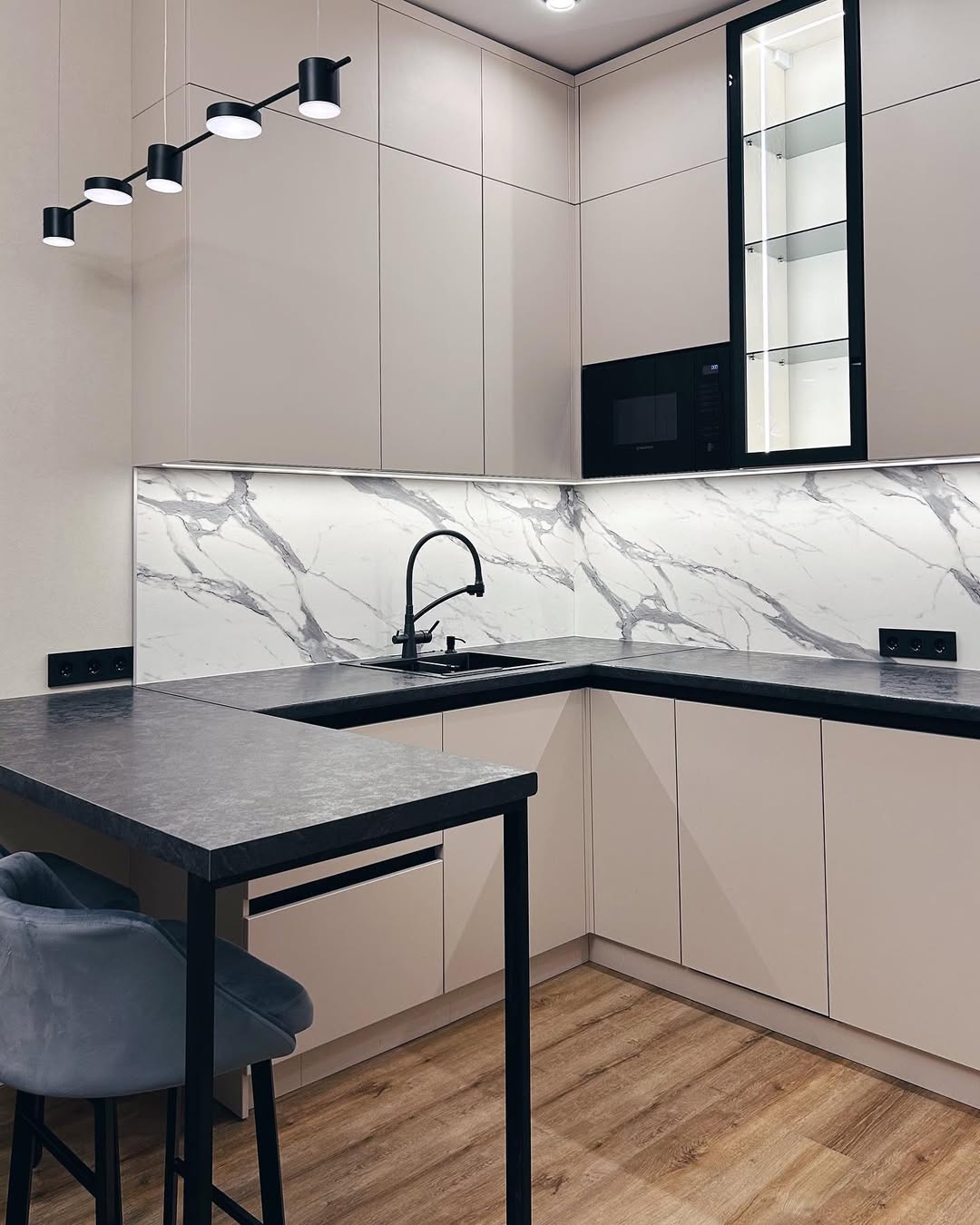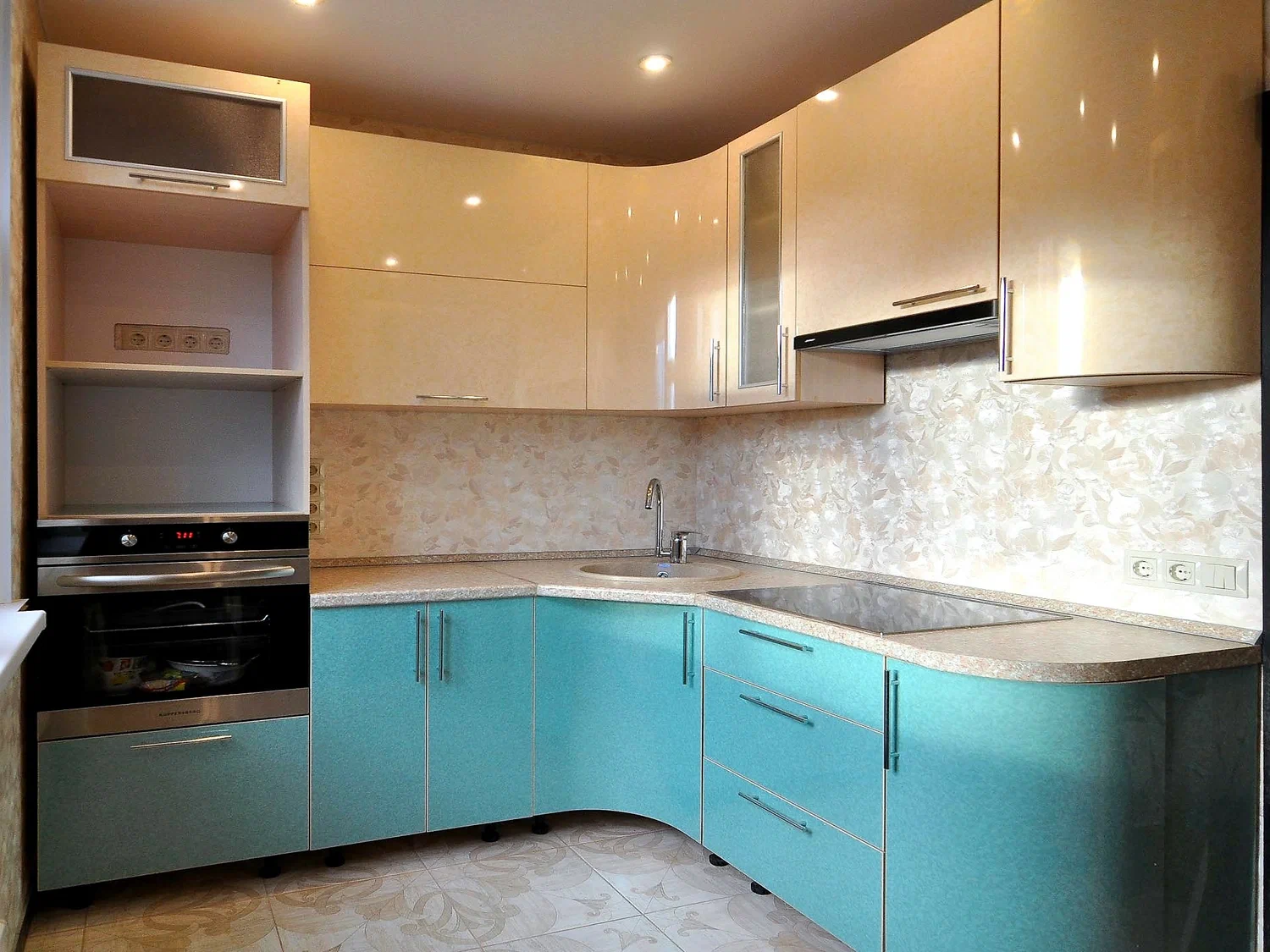 Фасады выбрали глянцевые — белый верх и бежевый низ. Такое сочетание смотрится стильно и современно, плюс глянец визуально расширяет кухню и делает её светлее. Столешница — прочная, тёмная, под камень. На ней удобно работать, не боится горячего и легко моется.