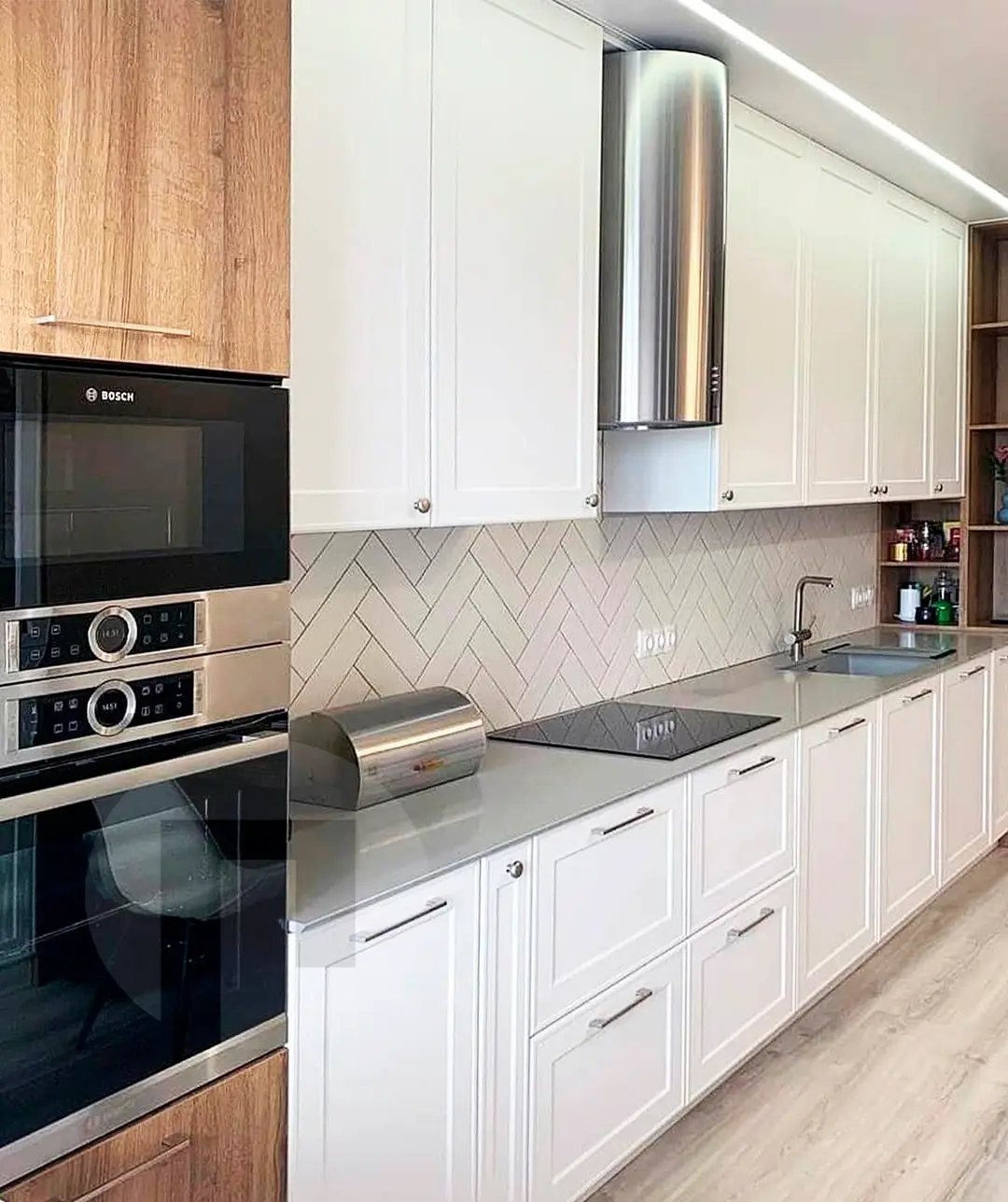 Кухню сделали с удобной техникой: встроенный холодильник, посудомойка, варочная панель, духовка и микроволновка. Всё под рукой и готовить одно удовольствие!